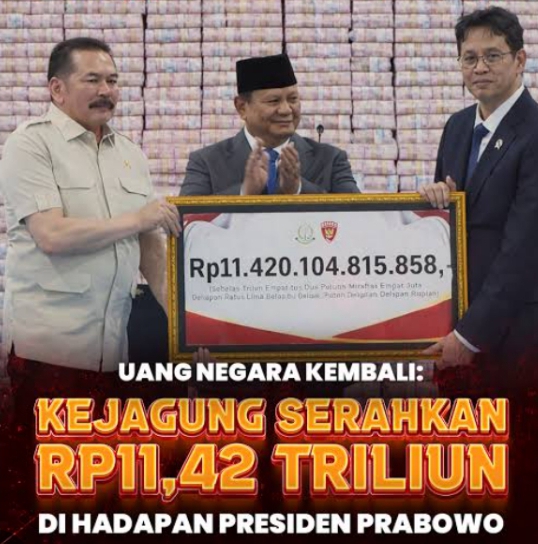 Total dana sebesar Rp11,42 triliun ini diserahkan langsung Jaksa Agung, ST Burhanuddin, kepada Menteri Keuangan dan Menteri Kehutanan.